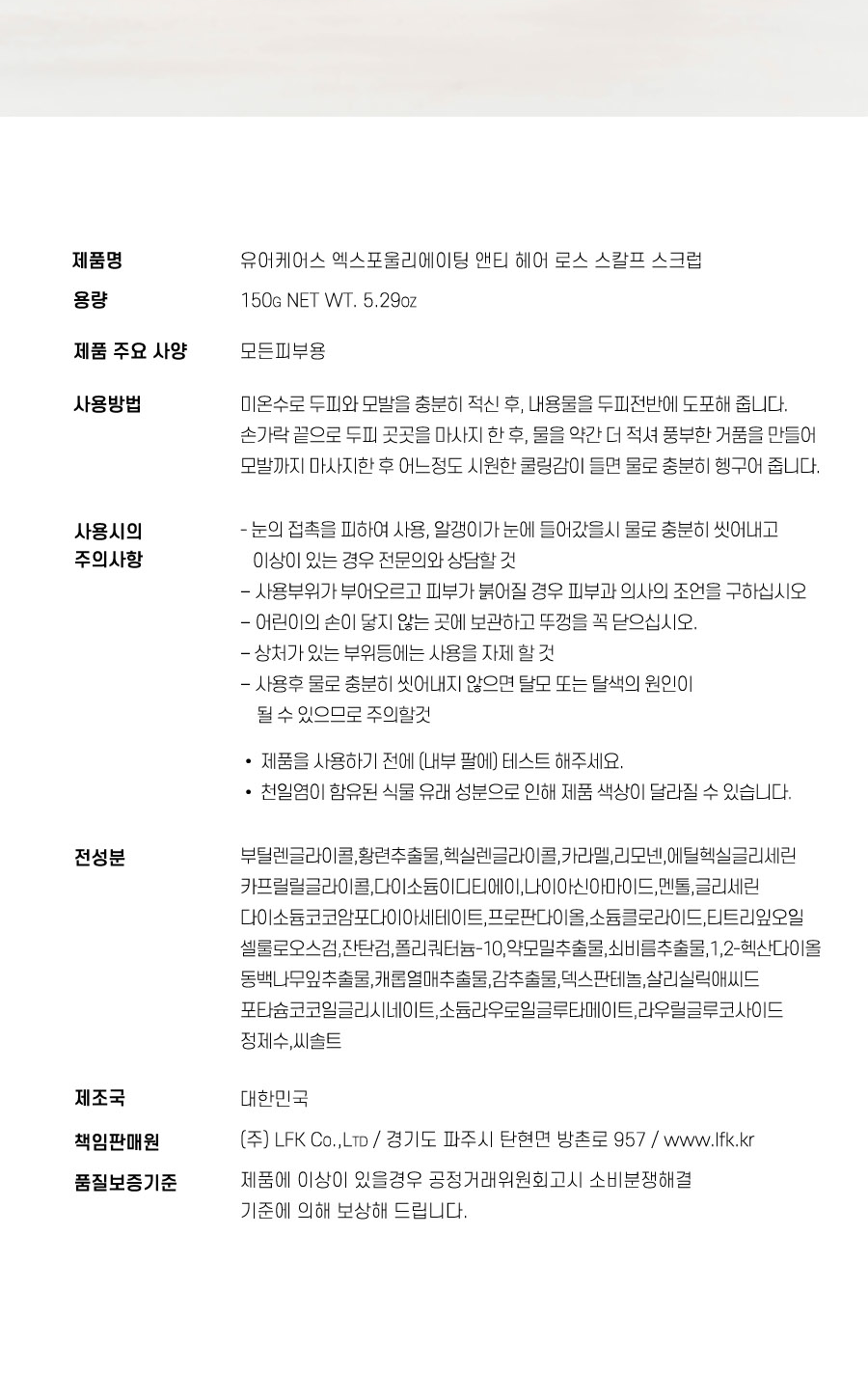 LFK Co., Ltd., LTD/957 Bangchon-ro, Tanhyeon-myeon, Paju-si, Gyeonggi-do /www.lifk.kr If there is an abnormality in the product, notice the Affirmative Transaction Committee to resolve the consumption dispute We will reward you by criteria.
